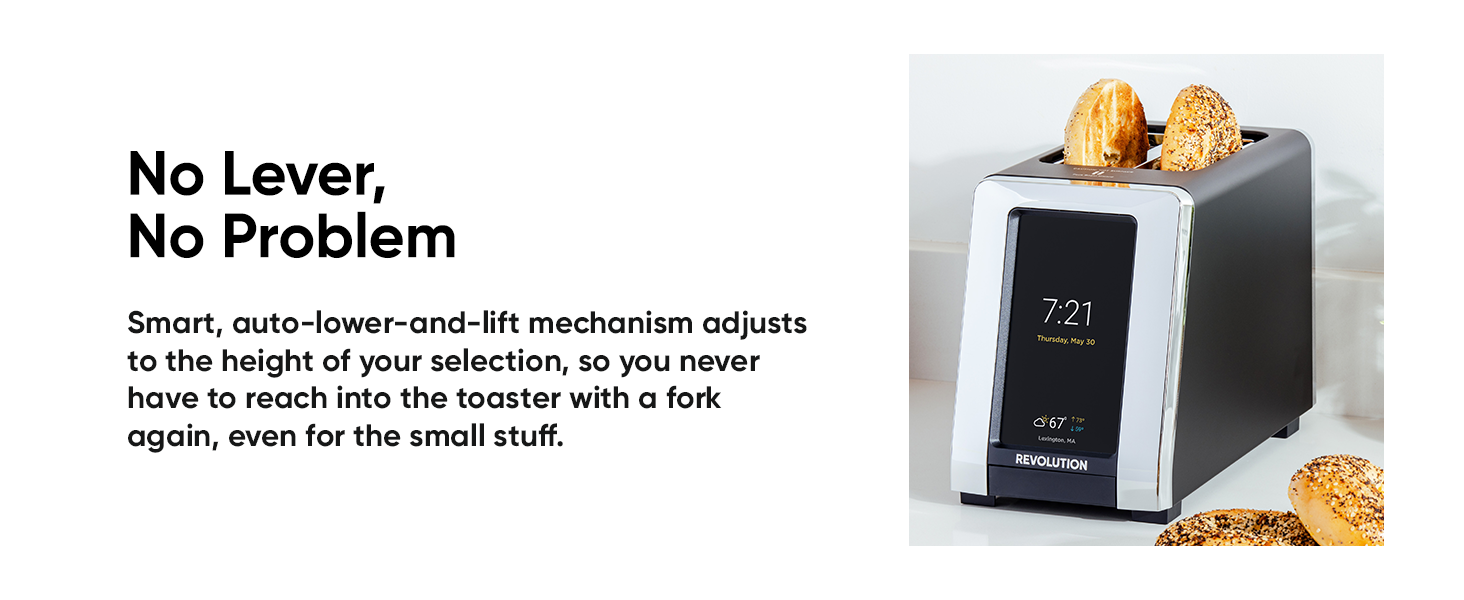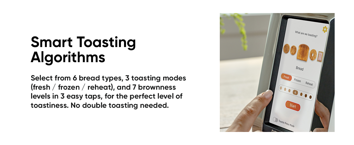 Our most customizable toasting experience with 38 bread types, 7 brownness levels in 3 easy taps, for the perfect level of toastyness, every time