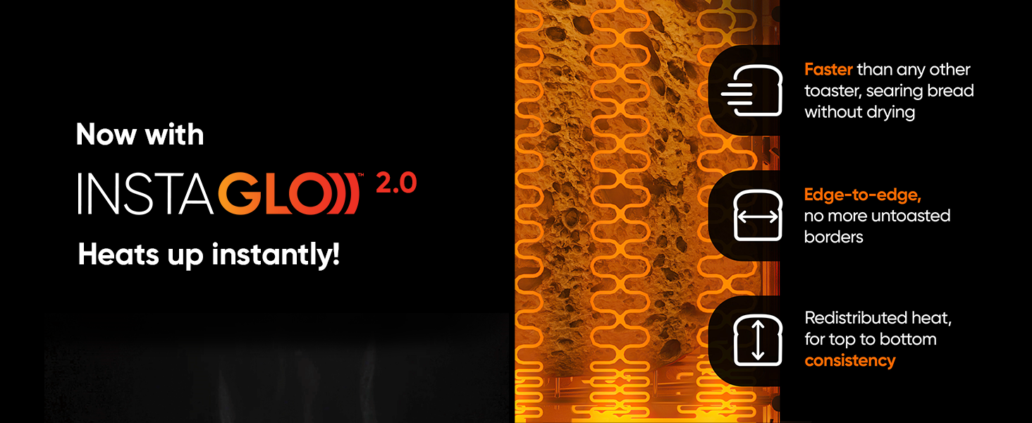 The new generation, with InstaGLO® 2.0 reaches full heat in seconds, searing the bread without drying it, so it's crispy on the outside, yet soft and delicious on the inside